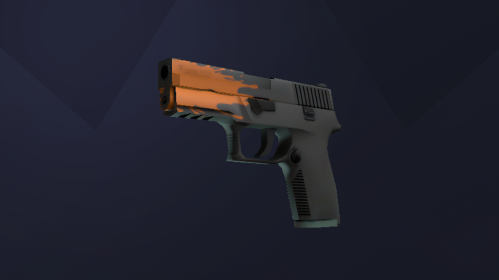 - P250 | Splash: Esineessä tumma tausta jossa yksittäinen oranssi splash-maalaus.